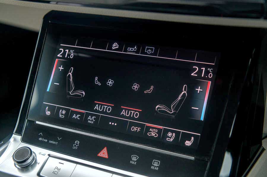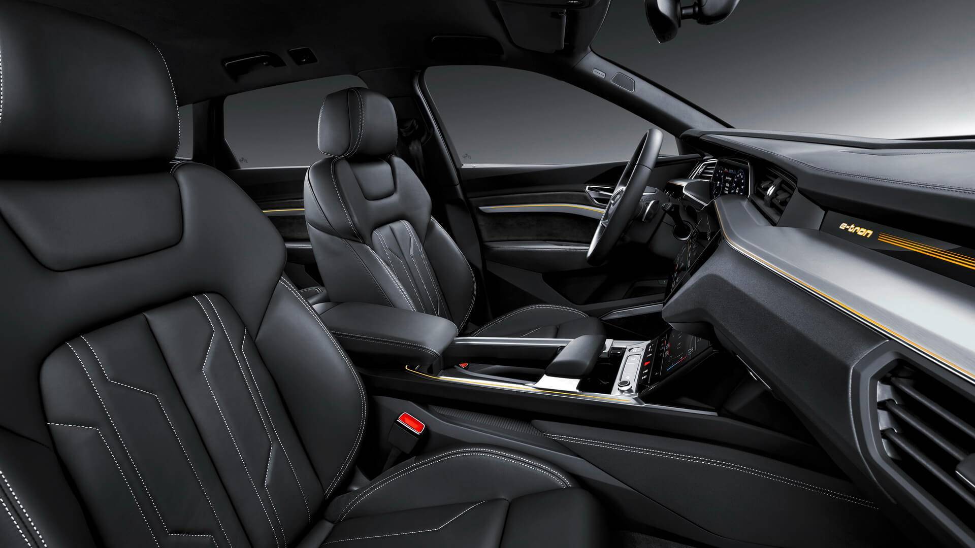 Задний ряд сидений оснащается отдельной климатической системой с управлением, широким подлокотником, есть функция проекции полезной информации на лобовое стекло, а в целом салонное пространство Е-Трон сильно напоминает интерьер Audi Q8.