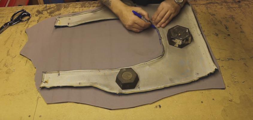 Подготовка к установке новых элементов кресла. По лекалам старых чехлов создаются свежие выкройки и эскизы, которые аккуратно переносятся на рабочую поверхность.
