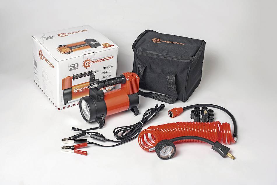 Комплект оснащен несколькими насадками и запасным предохранителем.В насосе есть фонарь, который работает в двух режимах. Дополнительное красное стекло помогает показать, что на дороге стоит машина.