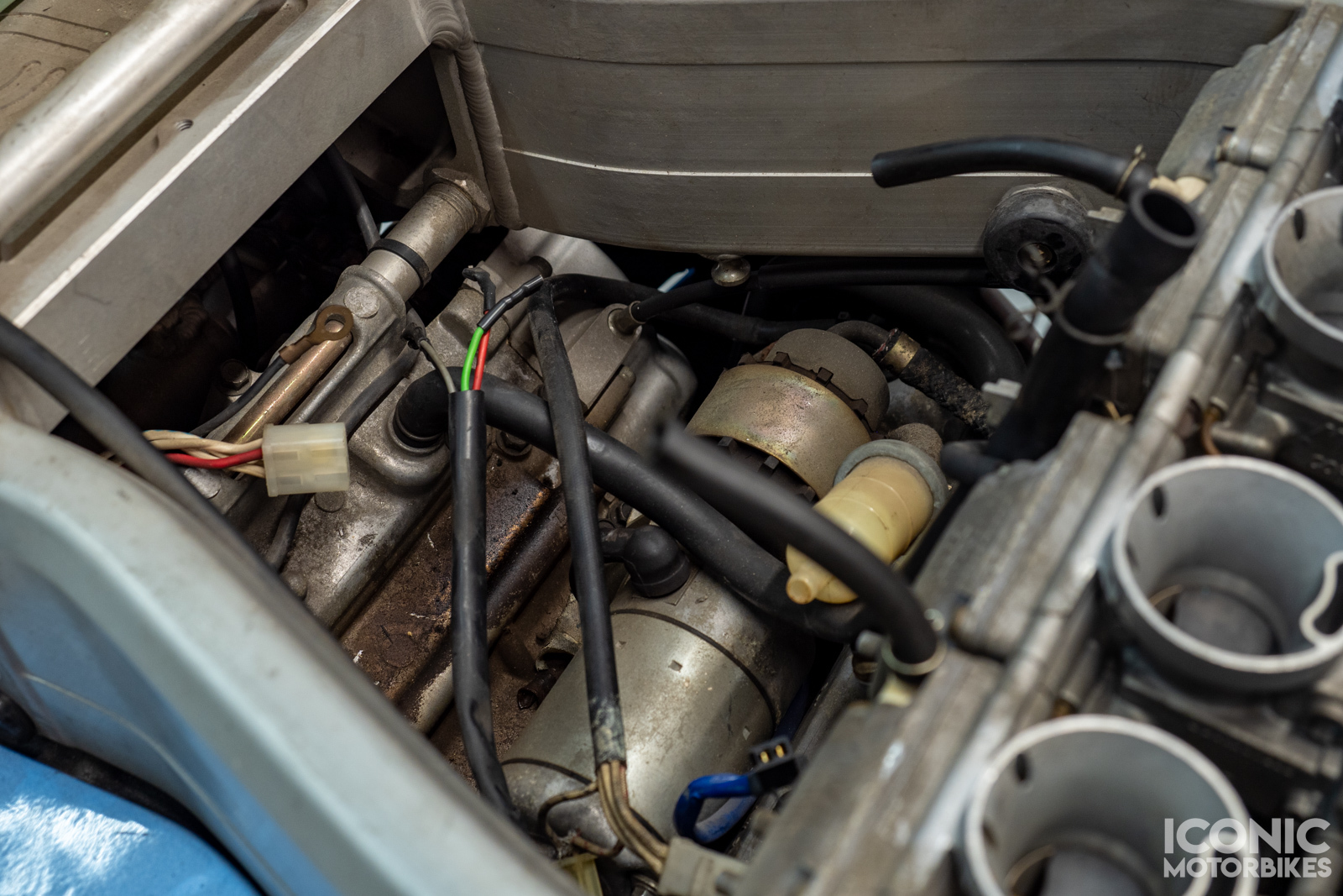 The bike is missing several parts: regulator/rectifier, fuel lines, petcock, fuel level sender. Several parts are also disconnected: carbs, throttle cables, airbox, water temp sensors, ignition coil, and some wiring. Additional components may be missing, this is being sold as a non-running display bike.