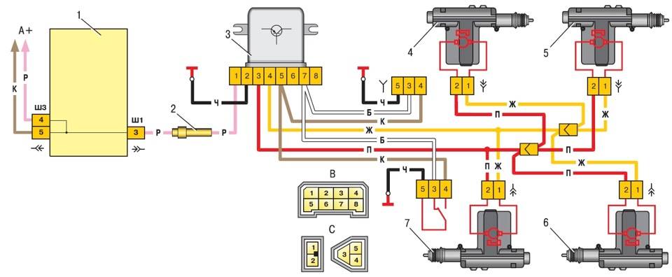 1 — штатный разъём на ВАЗ 2109, 2 — предохранитель на 10 А, 3 — блок управления ЦЗ, 4, 5, 6 — электроприводы пассажирских дверей, 7 — электропривод водительской двери