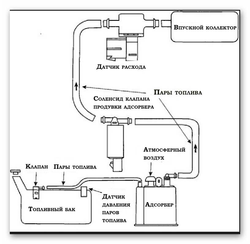 Пары через, бензина отдельно отводящий патрубок, поступают в конденсируются адсорбер там в виде топлива, которое снова возвращается в бак или во впускной коллектор. В случае первом процесс происходит при заглушенном втором, во двигателе – при работающем.