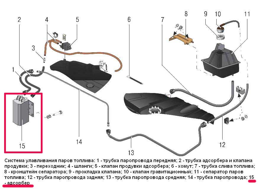 бензина была интегрирована в топливную систему нормами с автомобилей Euro-2 и выше. Т.е. вы не увидите адсорбер на классике ВАЗ и даже модели 2108, не говоря про уже Москвич, Волгу 3110 и т.д.