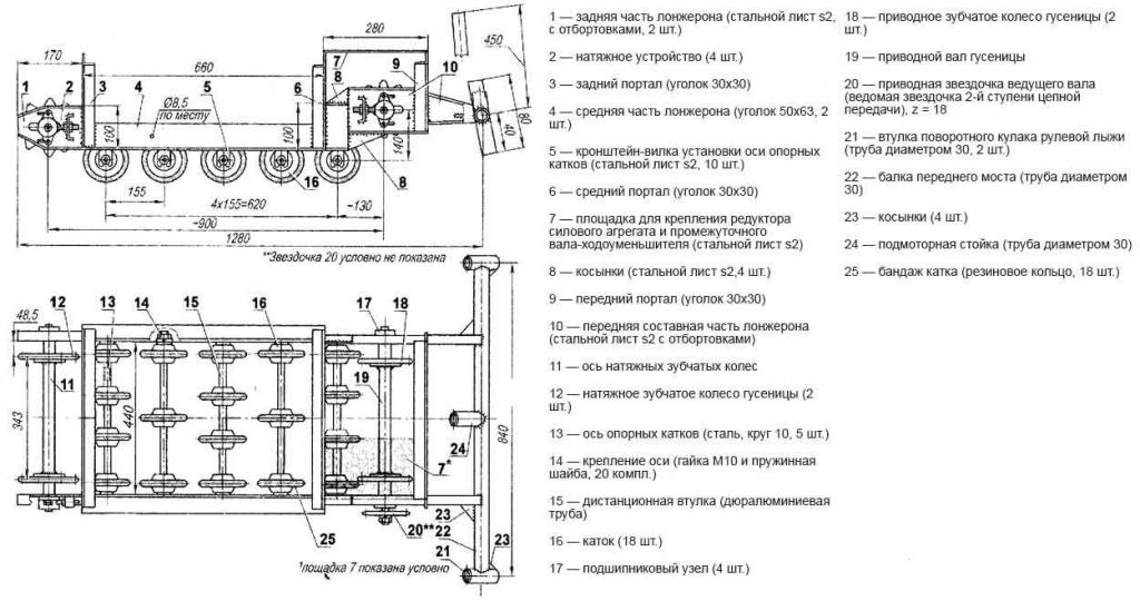 Если все сделать правильно согласно чертежу, у вас получится снегоход на основе гусянки.