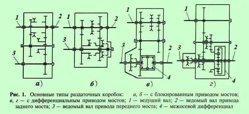 Мощность, отобранная от двигателя посредством сцепления и коробки передач, направляется к ведущим колесам автомобиля через карданную и главную передачу. Для автомобилей с одним ведущим мостом в данном случае поток мощности следует в одном направлении, а вот для автомобилей, имеющих два и более ведущих мостов, необходимо мощность двигателя распределить между всеми ведущими колесами пропорционально преодолеваемой ими нагрузке. В таких автомобилях для распределения крутящего момента между ведущими мостами применяются раздаточные коробки.Кроме того, установка понижающей передачи в раздаточной коробке позволяет значительно увеличить передаваемый крутящий момент и тяговую силу, способствуя повышению проходимости автомобиля. Поэтому многие раздаточные коробки способны выполнять две основные функции – распределение крутящего момента от двигателя между всеми ведущими колесами, а также изменение, при необходимости, величины передаваемого крутящего момента.