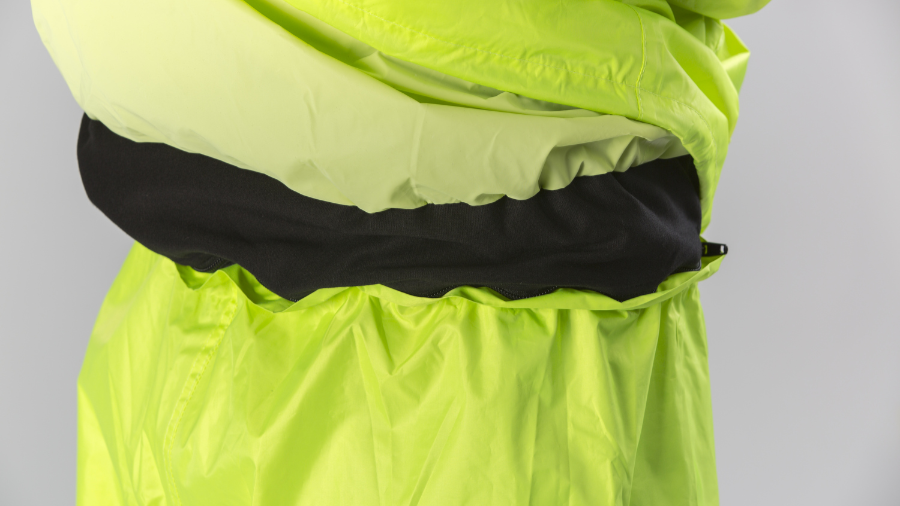 Классно сшит капюшон. Он достаточно большой, чтобы налезть на шлем, имеет светоортажающую полосу и резинку по периметру.