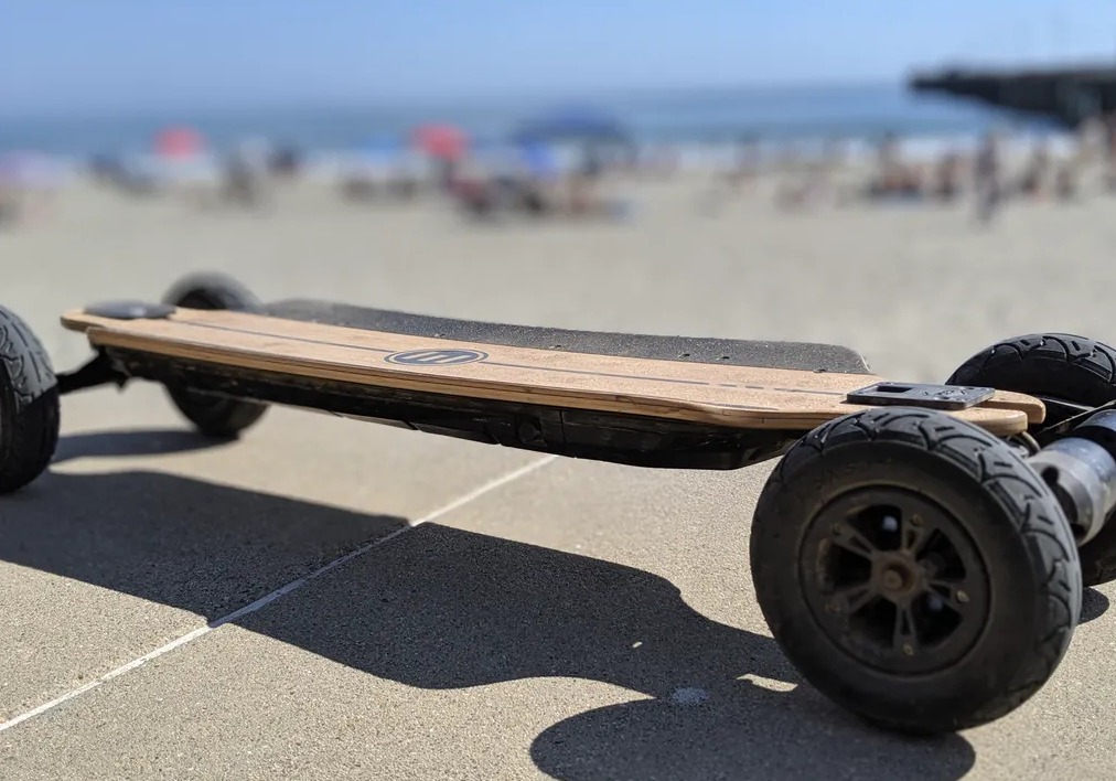 Внедорожный электрический скейтборд Y8 с пультом дистанционного управления. Пневматические колеса из жёсткой резины, 7,8 дюйма. Производитель разрешает передвигаться по бездорожью, тротуарной плитке и асфальту, обещая хорошее сцепление.
