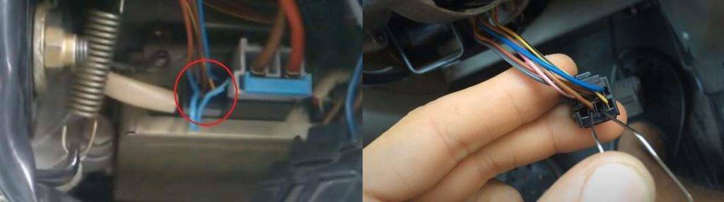 Разбираем защитный чехол рулевой колонки, добираемся до блока управления усилителя. Находим колодку черного цвета с шестью проводами. Необходимо замкнуть между собой 7 и 6 контакты – «массу» и «К-линию». Если смотреть на колодку со стороны проводов, то отсчет идет справа на лево, сверху вниз. На нужен коричневый провод – контакт номер 7 и пустое гнездо, не задействованное – номер 6 по счету.