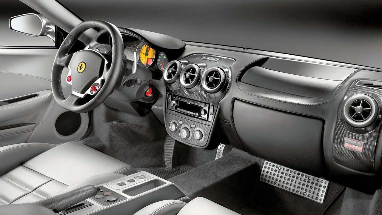 Салон Ferrari F430 имеет 3-х спицевый руль, на котором расположены кнопки переключения режимов езды и клавиша запуска силового агрегата. Приборная панель имеет аналоговые приборы и самый большой прибор это тахометр, так как это спортивный автомобиль, кстати, максимальная отметка на нем равна 10 000 об/мин. Также на руле присутствуют лепестки переключения передач.