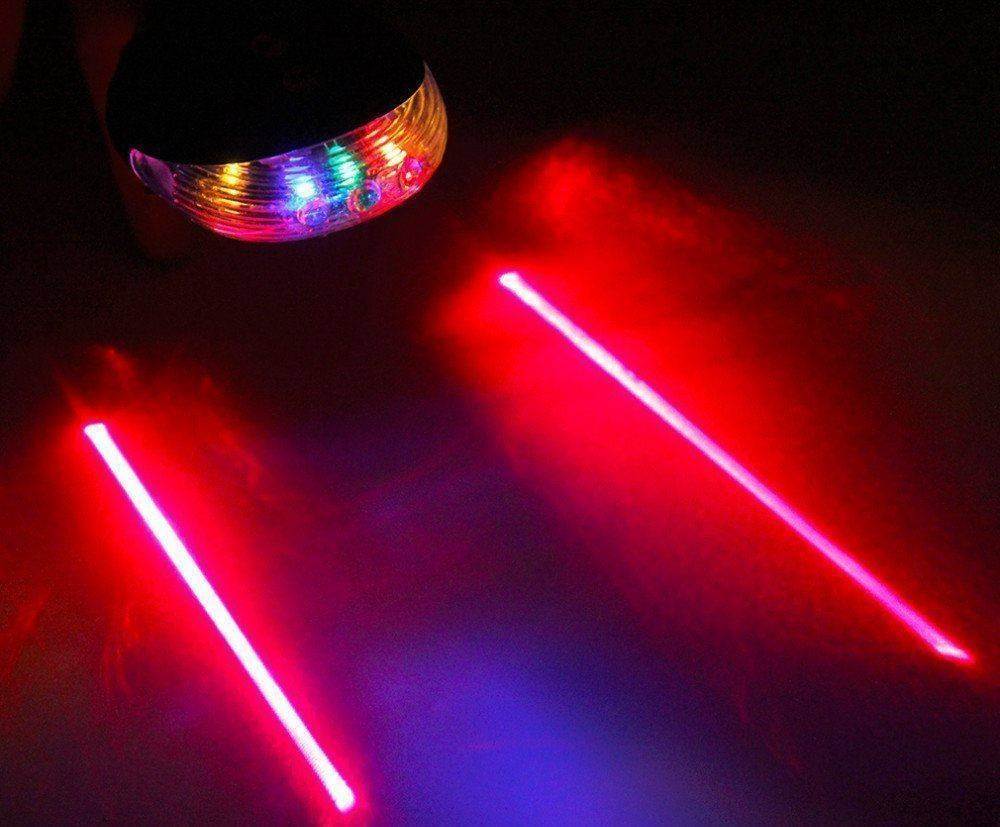 - Лазерные. Популярный вид велофонарей, главной особенностью которых являются красные дорожки света по бокам от велосипеда, которую чертят лазеры. Такой эффект значительно повышает заметность велосипедиста, а также придает яркий привлекательный вид транспортному средству.