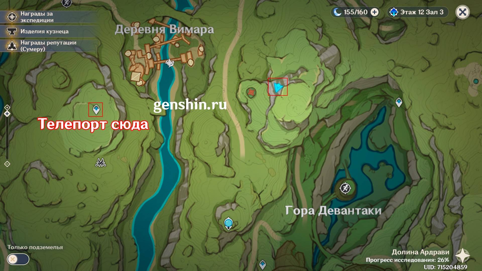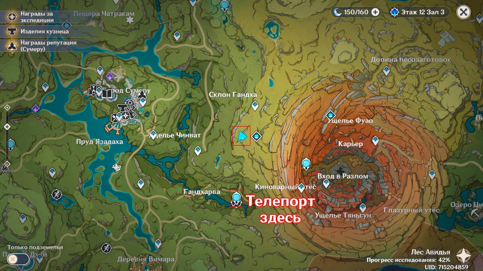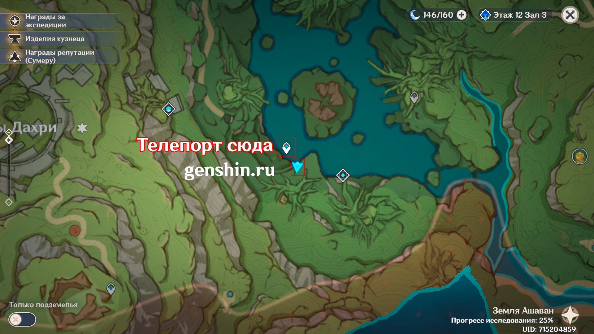 Отправляемся к месту на снимке и рядом откапываем сундук. Телепортируемся к Статуе Архонта в Ванаране: