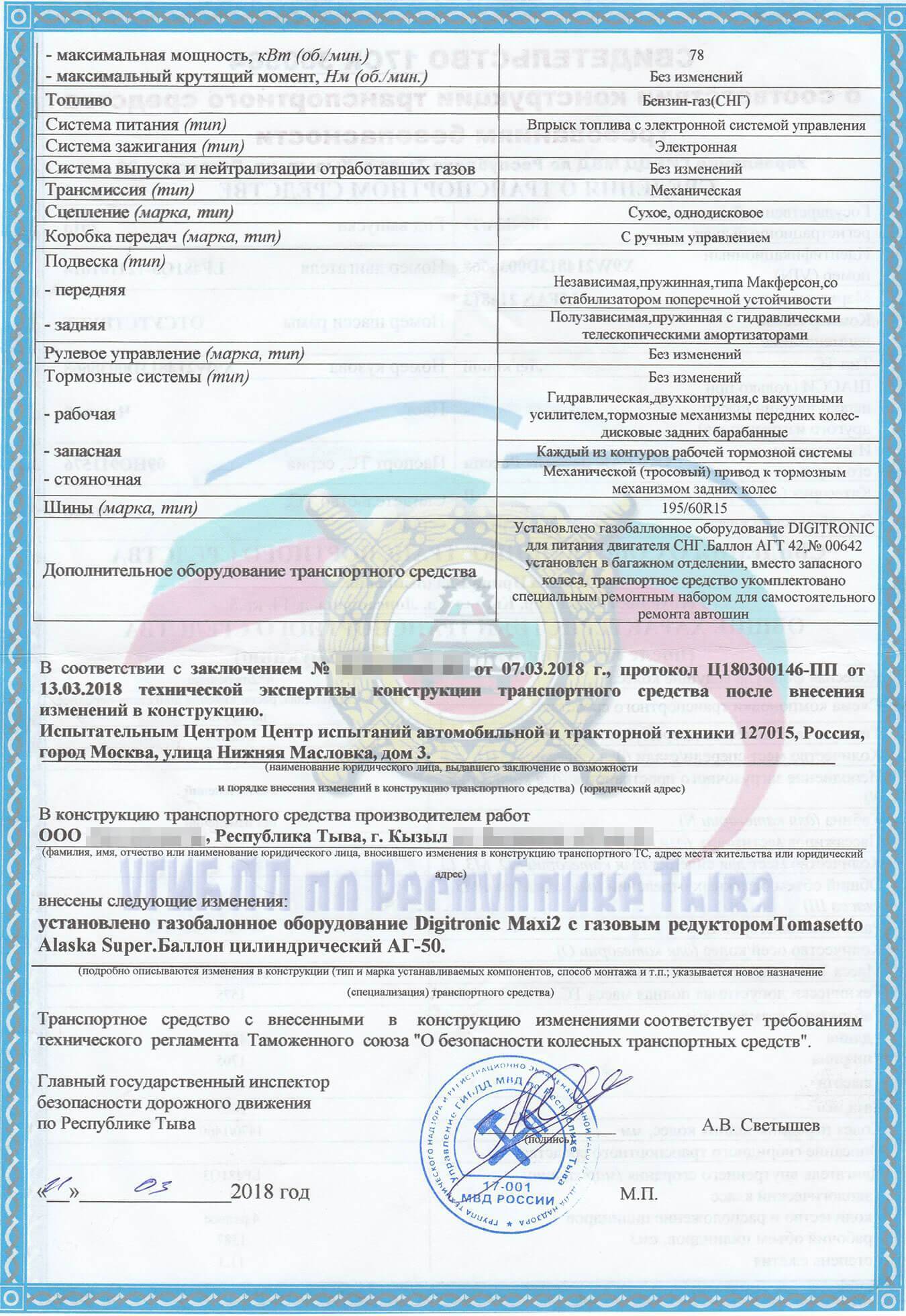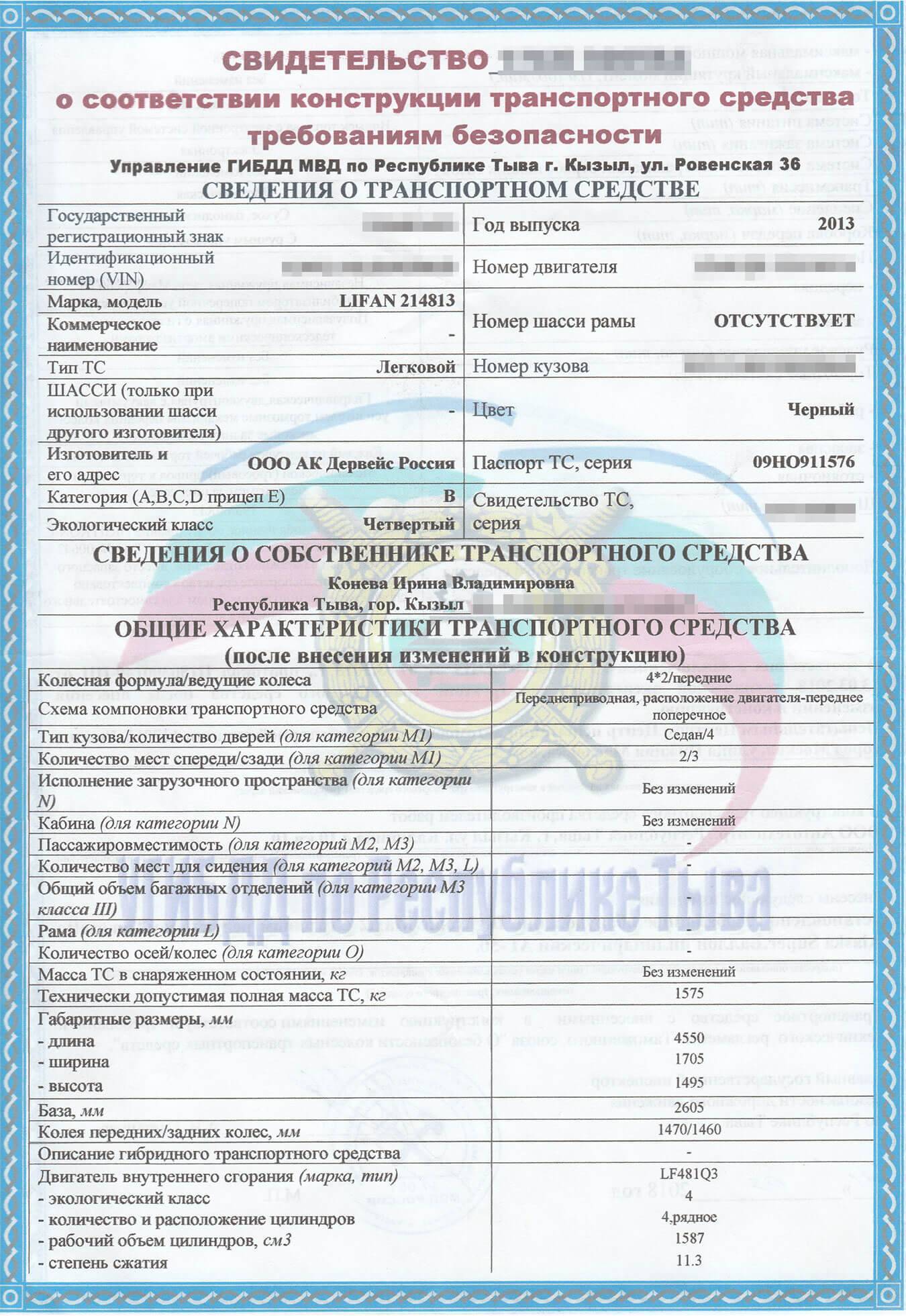 В результате мне заменили свидетельство о регистрации автомобиля, внесли изменения в ПТС и выдали документ о том, что конструкция автомобиля соответствует требованиям безопасности.