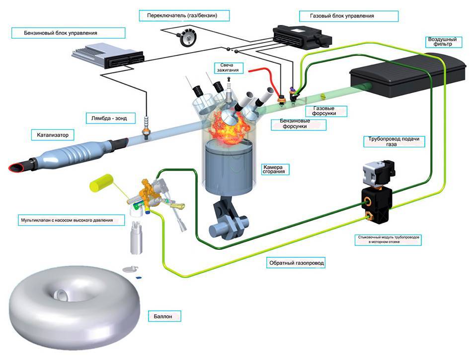 - Рампа с форсунками работает в том же режиме, что и при бензине, поэтому разницы в работе двигателя не ощущается.