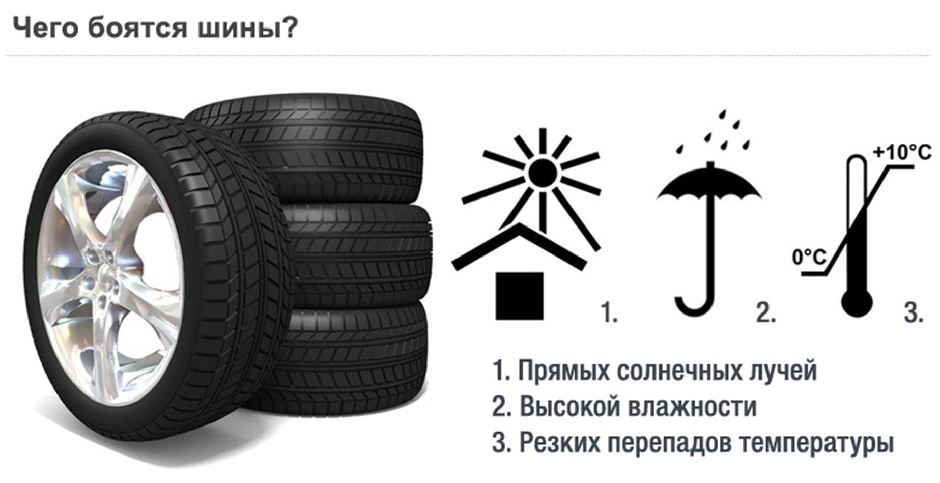 В помещении не должна быть повышенная влажность, чрезмерный холод или же жара, яркий свет, так как все эти факторы негативно отразятся на ней и приведут к быстрому старению, поэтому лучше не оставлять колеса на балконе. Потеряв свою эластичность, они сразу же станут непригодны к эксплуатации, так как не смогут обеспечить должного сцепления с дорожным покрытием, особенно, если оно запорошено слоем снега или вообще ледяной коркой.
