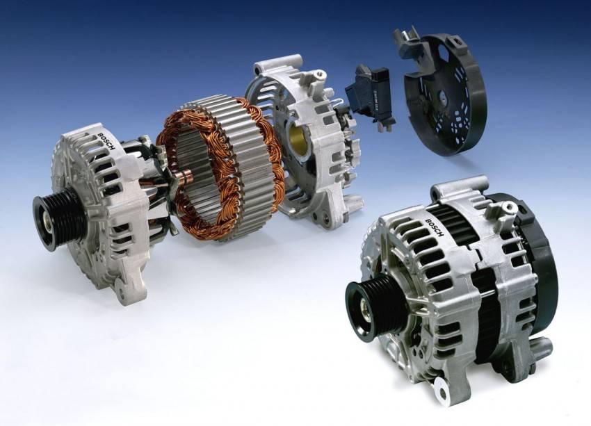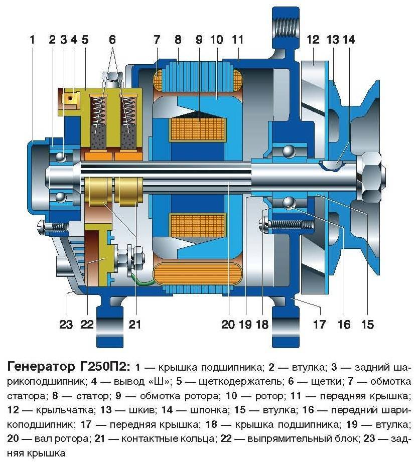 Автомобильные генераторы выполняют одну и ту же функцию, работают по одинаковому принципу, но отличаются друг от друга размером, схемой реализации деталей узла, размерами шкива, характеристиками выпрямителей и регулятора напряжения, наличием охлаждения (жидкостное или воздушное часто применяются на дизельных двигателях). Генератор состоит из: