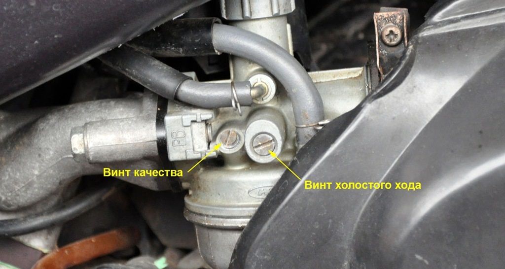 - завести скутер – если техника не заводится или обороты низкие или высокие, то настройкой холостого хода увеличить их (при низких оборотах) или уменьшить (при высоких);