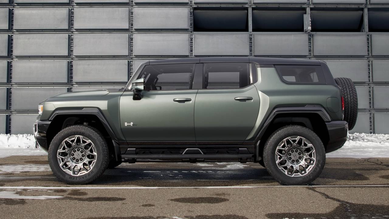 - Hummer EV2 SUV: два электромотора, отдача – 634 л.с. и 10 033 Нм, пробег на одной зарядке – 400 км, обычное шасси с пружинной подвеской;