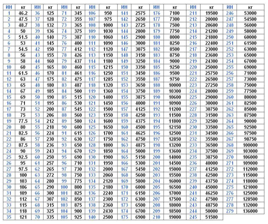 | Индекс нагрузки | 100 | 101 | 102 | 103 | 104 | 105 | 106 | 107 | 108 | 109 |