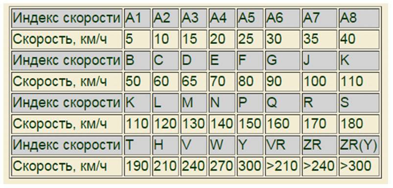 Каждый буквенный символ индекса скорости «привязан» к определенному скоростному пределу. Для того чтобы выяснить, какой скорости соответствует та или иная литера на боковой поверхности покрышки, следует обратиться к таблице индексов скорости.