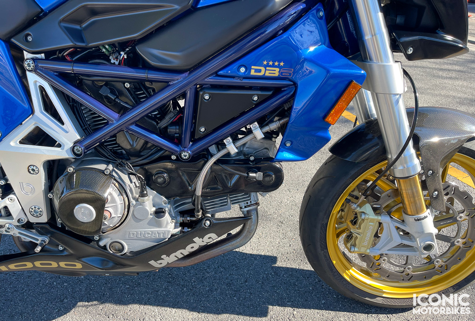 DB6 использует 1079-кубовый десмодромник, в точности такой же, как на Ducati Hypermotard. Это означает, что сцепление оборудовано проскальзывающим механизмом, а мощности мотора достаточно, чтобы весь день проездить на заднем колесе. Сочетание грохота десмодромного привода клапанов и клацанья сухого сцепления незабываемо, и всегда заставит райдера счастливо улыбнуться.