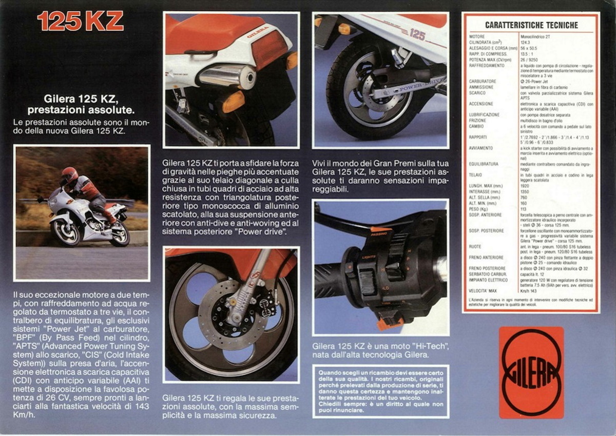 Nell’agosto del 1987 la rivista Moto Sprint mise a confronto, in una delle “folli” comparative organizzate da Claudio Braglia, sette Gilera 125, praticamente tutto il listino delle ottavo di litro della Casa di Arcore, che comprendeva le enduro RC 125 Rally, ER 125, RRT 125 Nebraska, la “motard” Fastbike e ovviamente la KZ, anche in versione Endurance, e la KK. I dati rilevati all’epoca furono ovviamente molto vicini a quelli reali, ma sempre di poco superiori, il contrario di quanto avveniva sempre quando si testava al banco o in pista una moto.