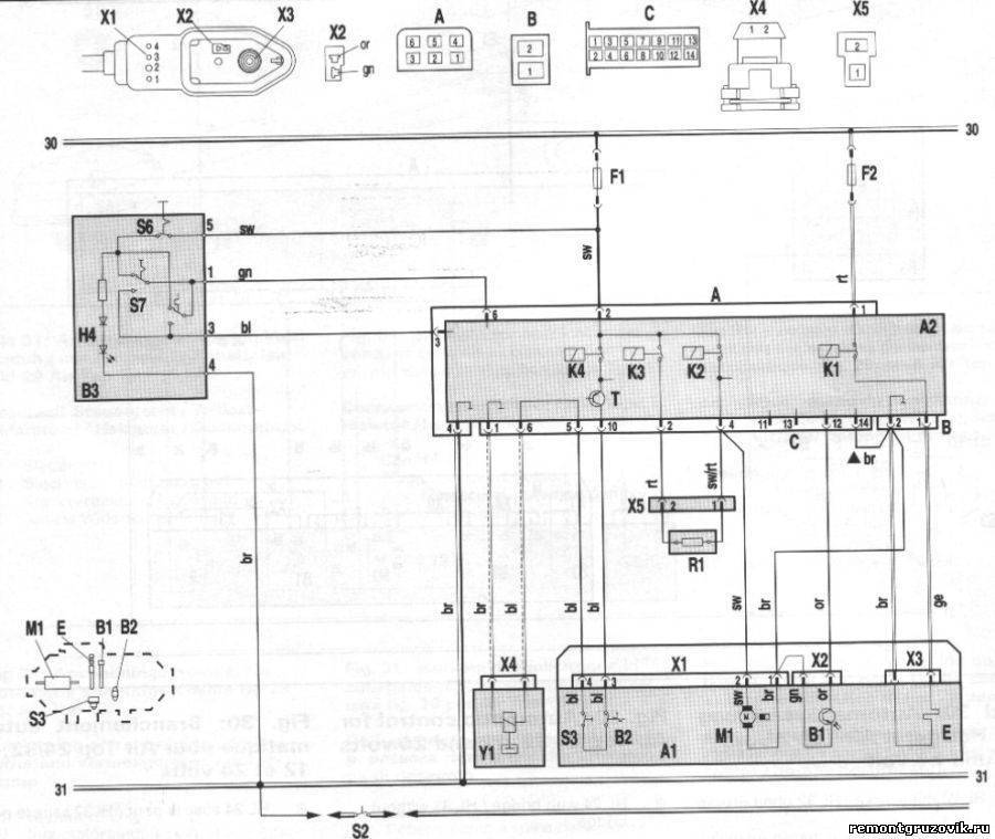 1 – пульт отопителя; 2 – переключатель отопителя; 3 – реле отопителя; 4 – блок реле и предохранителей в салоне; 5 – резистор; 6 – вентилятор; 7 – моторедуктор заслонки «ноги-грудь»; 8 – моторедуктор заслонки «тепло-холод»; 9 – моторедуктор заслонки рециркуляции; 10 – электрокран; 11 – генератор; 12 – выключатель догревателя; 13 – топливный насос; 14 – реле включения догревателя; 15 – диагностический разъём; 16 – пульт управления; 17 – электронасос; 18 – догреватель; F42 – блок реле и предохранителей в салоне; F44 – блок реле и предохранителей под капотом; XP 25/229-С – колодка соединения жгута 25 (по кабине) со жгутом 229 (по панели) серого цвета; ХР 25/229-Ч – колодка соединения жгута 25 (по кабине) со жгутом 229 (по панели) чёрного цвета.