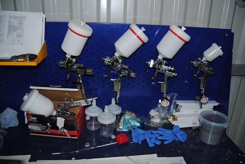 В перечень работ кузовного ремонта входят операции по окрашиванию. Очевидно, что для них также понадобится специальное оборудование. Вот краткий список того, что вам может понадобиться в процессе восстановления лакокрасочного покрытия автомобиля: