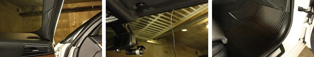 - Прикрепить устройство к переднему стеклу с помощью прилагаемой монтажной ленты. Настроить угол обзора. Спрятать проволоку в обшивке потолка, после – между стойкой A и стойкой B, затем – между резиной и передней стойкой.