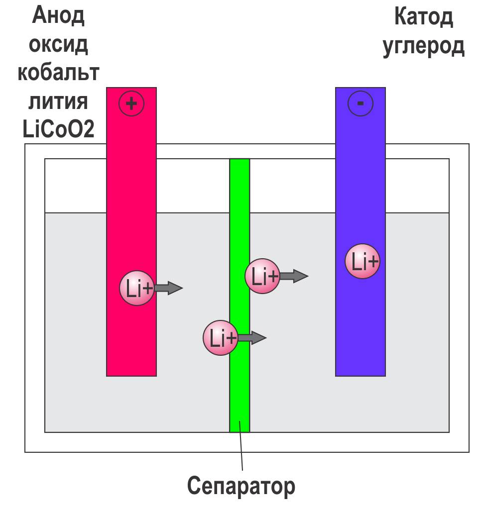 В литий-ионном аккумуляторе (ЛИА) заряд переносится ионом лития. Его характерной способностью является способность внедриться в кристаллическую решётку прочих материалов (в нашем случае это графит, окислы или соли металлов), образуя при этом химсвязи.