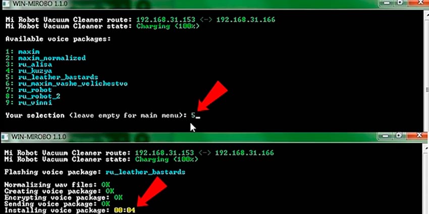 После этого необходимо переместить заранее скачанные голосовые пакеты в папку voicepacks и запустить файл win-mirobo.bat. Если все действия были выполнены корректно, на мониторе появится меню с выбором опций. Нужно выбрать Flash voice package, а затем указать номер требуемого пакета озвучивания. Далее останется дождаться завершения установки и испробовать новый функционал пылесоса.