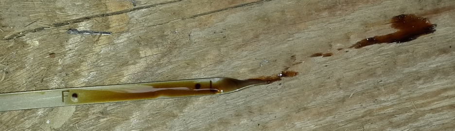 - Изучите цвет масла. В автомобиле моторное масло, которое необходимо срочно менять, приобретает черный цвет. Если расходный материал имеет желто-коричневый оттенок, и в нем не наблюдается элементов нагара, водных капель или металлической стружки, значит с моторным маслом все в порядке.