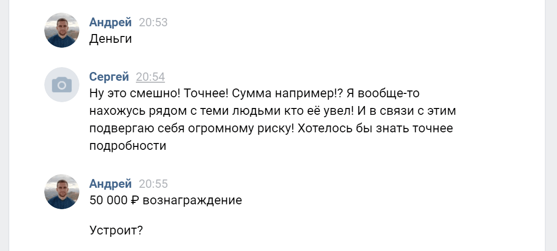 Пока я искал машину, со мной связались двое. Оба утверждали, что знают, где стоит моя машина, и готовы поделиться этой информацией. Я просил их прислать фотографии, они начинали юлить: