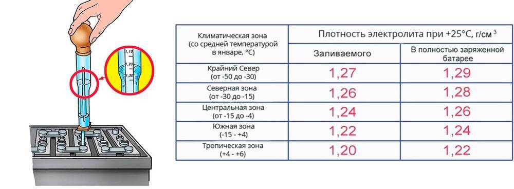 Нормальная плотность составляет от 1,27 до 1,29 г/см3. Снижение на 0,01% указывает на то, что ёмкость сокращается на 4-5% с каждым таким шагом.