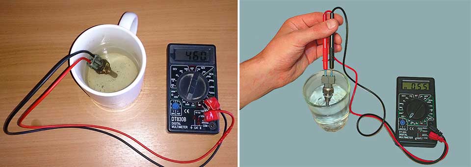 Головка датчика опускается в воду, а к его контактам присоединяются щупы тестера. Также в емкость с датчиком помещается и термометр, для удобства измерений желательно электронный, но можно и ртутный.