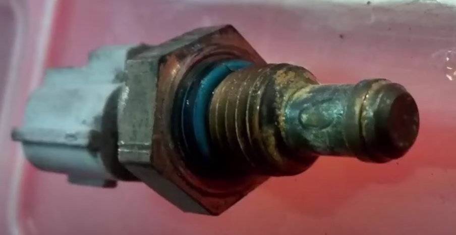 Поврежденный корпус. Выражается по-разному, но чаще это заметное подтекание ОЖ из резьбы датчика либо его корпуса. Также возможно повреждение самого терморезистора или его контактов, что ведет к выдаче им некорректного сигнала.