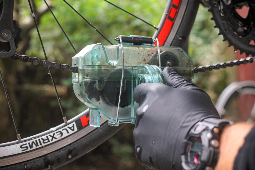 Этот метод очистки велосипедной цепи является наиболее рациональным и безопасным для детали, поскольку она во время процедуры остается на месте. Способ еще называют «машинным», поскольку во время процесса клининга применяется «спецсредство» — чистящая машинка в пластиковом корпусе. Это приспособление оснащено особыми шестеренками, которые захватывают цепь, а дальше сгибают ее и окунают в растворитель. Велосипедист, занимающийся очисткой, только крутит педаль и следит за процессом, чтобы прекратить его как только цепь станет достаточно чистой.