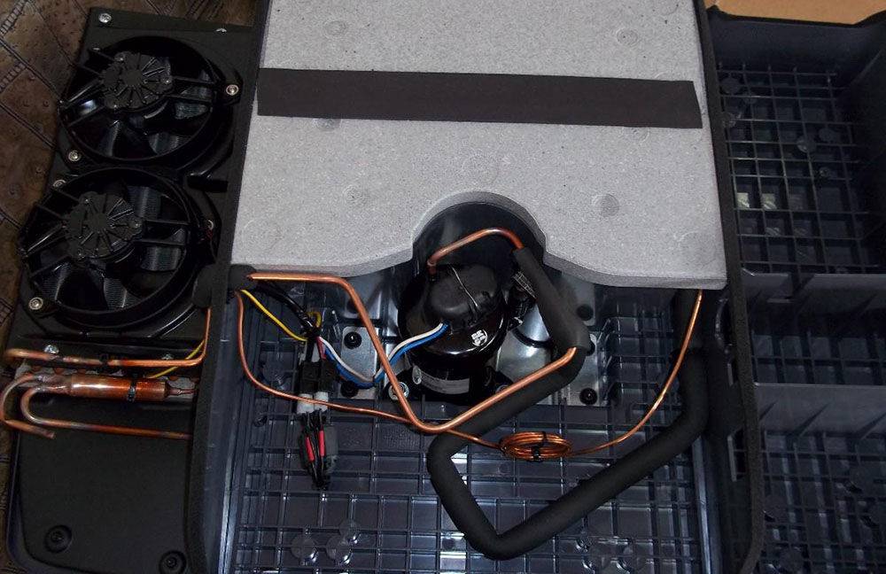 По части коэффициента полезного действия при охлаждении салона авто они не имеют равных, поскольку их схема практически не отличается от конструкции обычного автокондиционера. То есть такая климатическая система имеет замкнутый контур, по которому циркулирует хладагент, способный легко переходить из одного агрегатного состояния в другое и при этом генерировать в одном случае – холод, в другом – тепло. Основная проблема заключается в обеспечении требуемого теплоотвода. Штатный кондиционер конструктивно выполнен таким образом, что тепло выводится наружу через моторный отсек. Для портативного устройства такой вариант не годится.