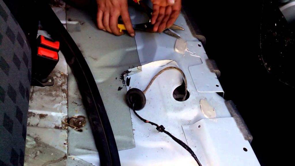 проделать отверстие в полу под задним сидением (желательно заранее сделать шаблон)