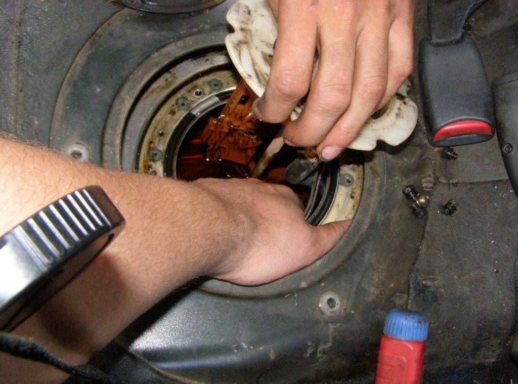 При демонтаже следует ножницами по металлу увеличить отверстие, в котором установлен бензонасос