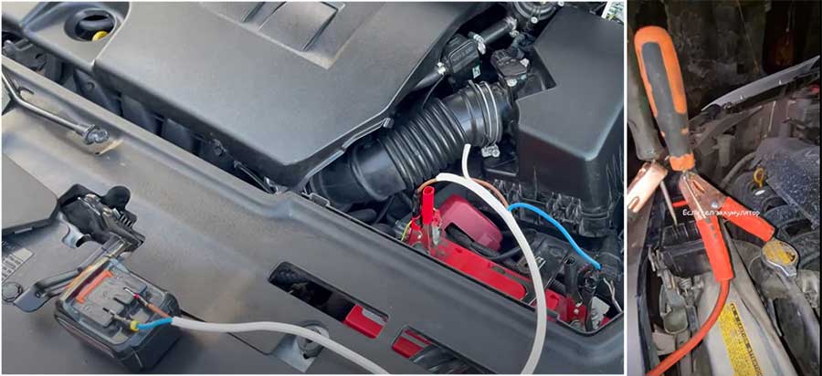 Для большей безопасности можно заранее подготовить провода для подключения. С одного края предусмотрите кольцо, которое легко вставиться разъем «плюса» и «минуса» батареи, а с другой — обычные «крокодилы». Остальной алгоритм действий повторяет рассмотренную выше инструкцию.