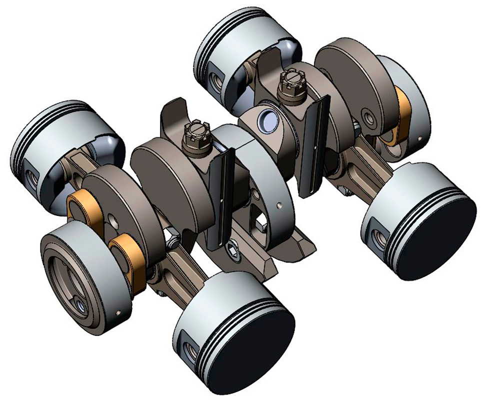 - шатуны заменены на поршневые штоки, они жёстко скрепляются с поршнями;