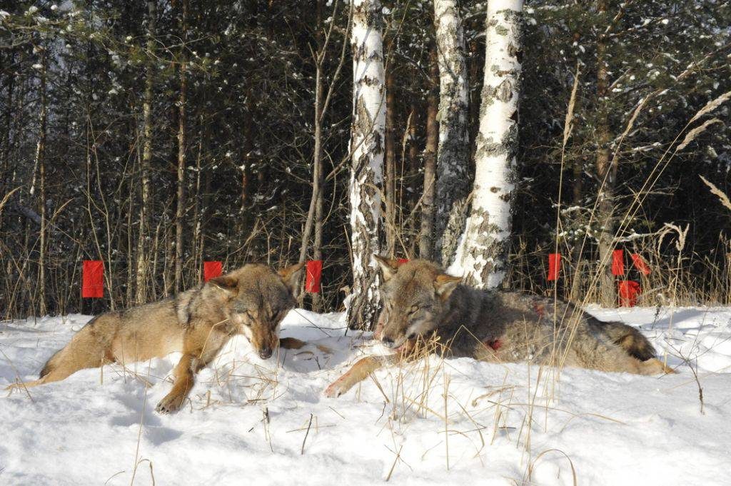 Установку красных флажков выполняют очень осторожно, чтобы не привлечь внимание волков и не спугнуть их. Один охотник разматывает моток в флажками, другой крепит их на ветках деревьев и кустов