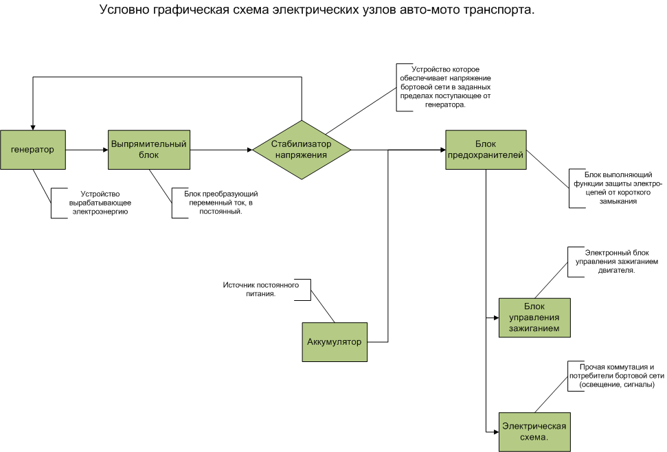 Перед вами представлена условно графическая схема узлов электрической цепи мотоцикла в целом. Разберём значение и функции блоков.
