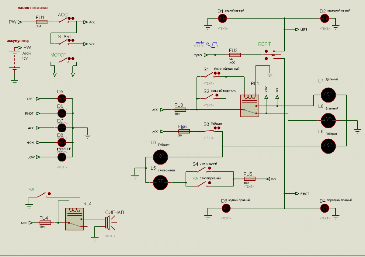 Предложенная схема выполнена на реле (RL), лампах (L), светодиодах (D) и переключателях (S). Так же в схеме присутствуют предохранители обозначены (F). На схеме отсутствует реле повторителей, что на самом деле является генератором импульсов и реле, при включении которое замыкает и размыкает контакты. Вместо реле повторителей на схеме подключен генератор (repitor), а сам переключатель поворотов подписан “REPIT” Питание схемы производится через подключение PW, в эту же точку приходится подключение от реле-регулятора подающего питание от генератора. Блок зажигания здесь не представлен. На светодиодах D5-D9 собрана эмуляция приборной доски, при включении того или иного потребителя, индикация происходит на данной панели. Ближний свет – LOW (L8), дальний свет – HIGH (L7), правая сторона повторителей – RIGHT (D1, D2), левая сторона повторителей – LEFT (D3, D4).