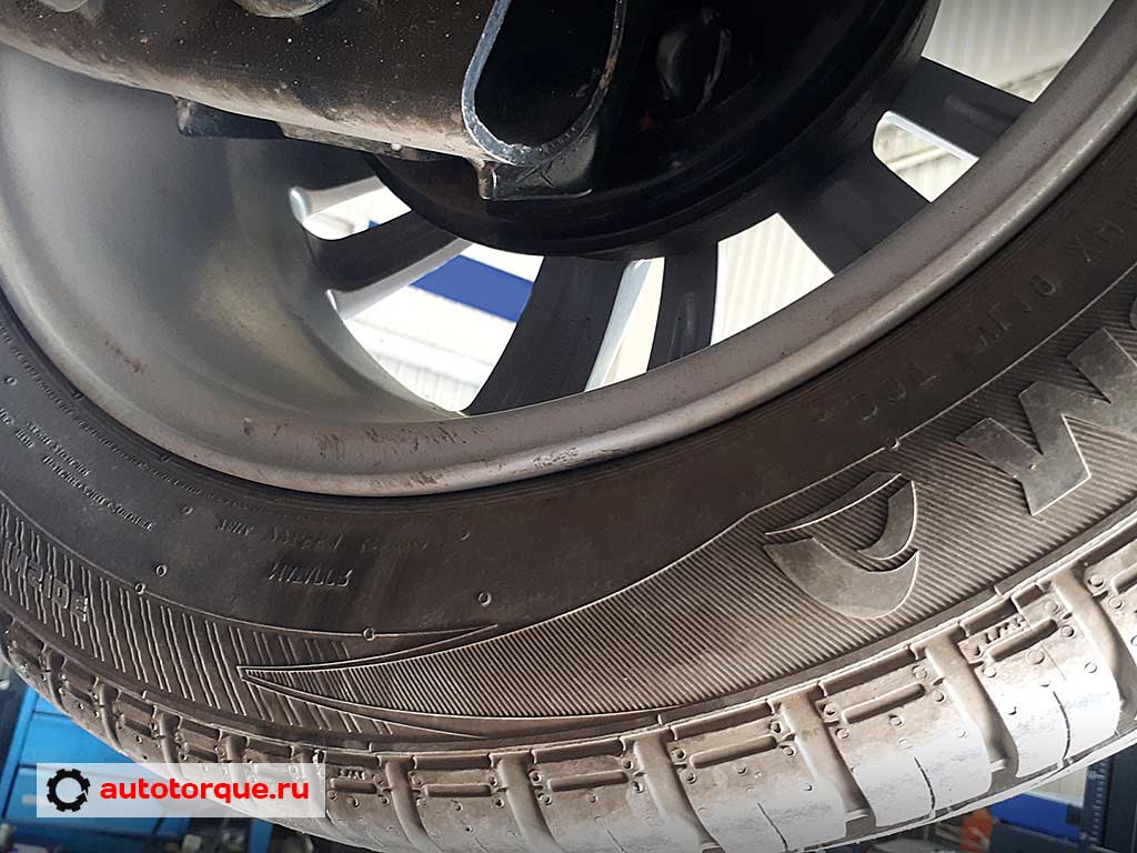 Штатные литые диски оказались нежнее покрышек. Ни грыжи ни порезов не получилось, а диск загнут