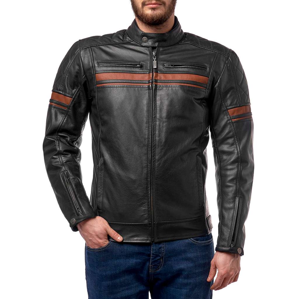 Мотокуртка – качественная и надежно защищенная, но в то же время достаточно легкая и комфортная в носке. Изготовлена из черной вощеной телячьей кожи толщиной около 1 мм. За счет специальных плечевых и локтевых вставок, а также продольной полосы на рукавах из светлой кожи смотрится очень эффектно. Куртка оснащена плотной съемной подкладкой-жилетом из многокомпонентного материала, защитной влагозащищенной мембраной, вставными протекторами в плечи, локти и спинную область. Внутренняя подкладка включает карманы для бумажника и смартфона.