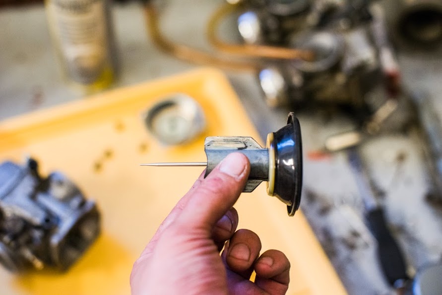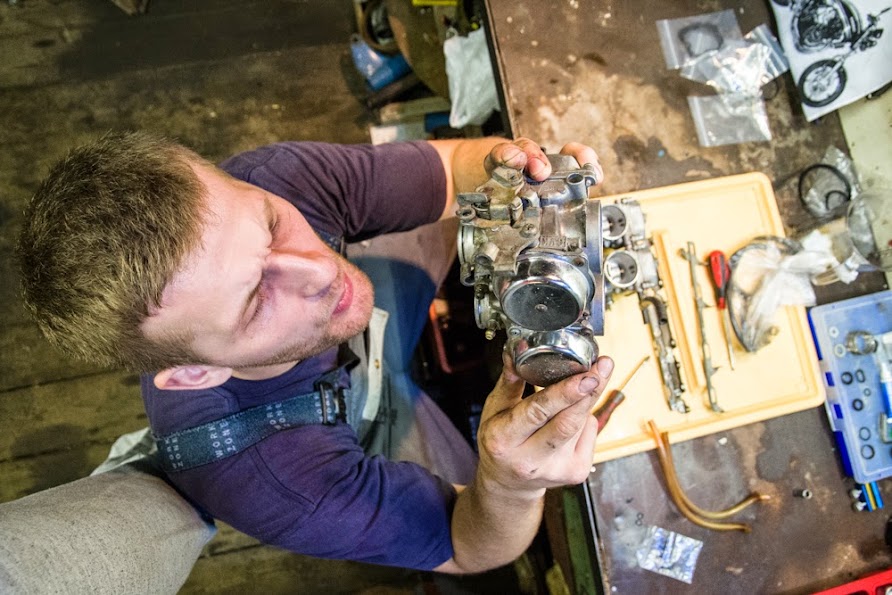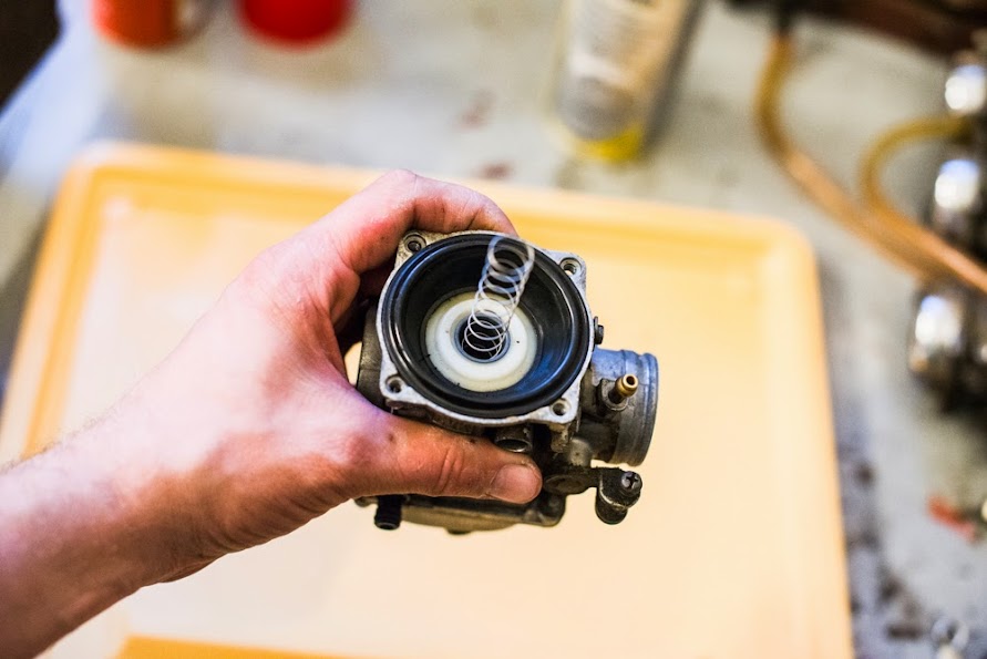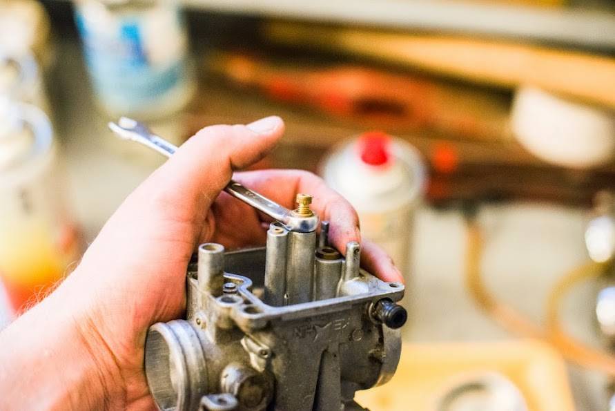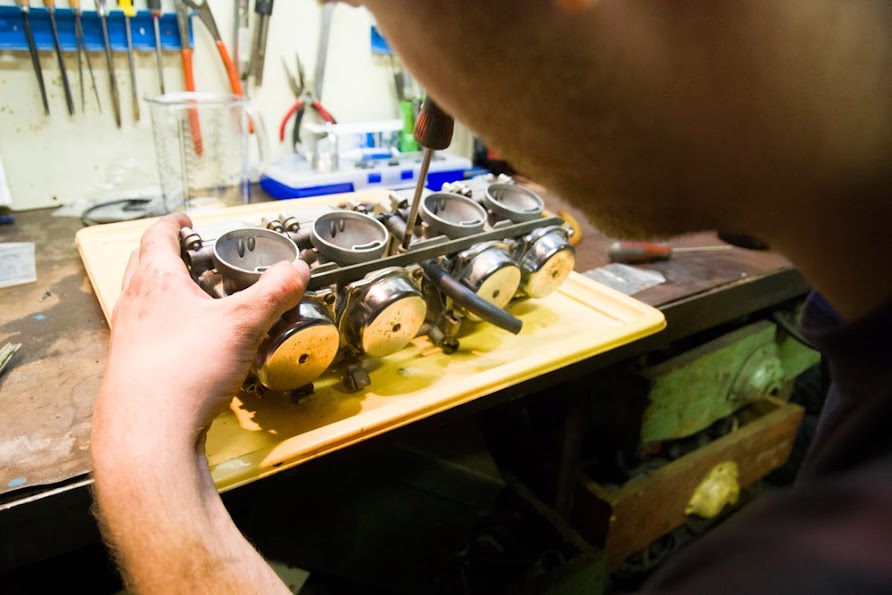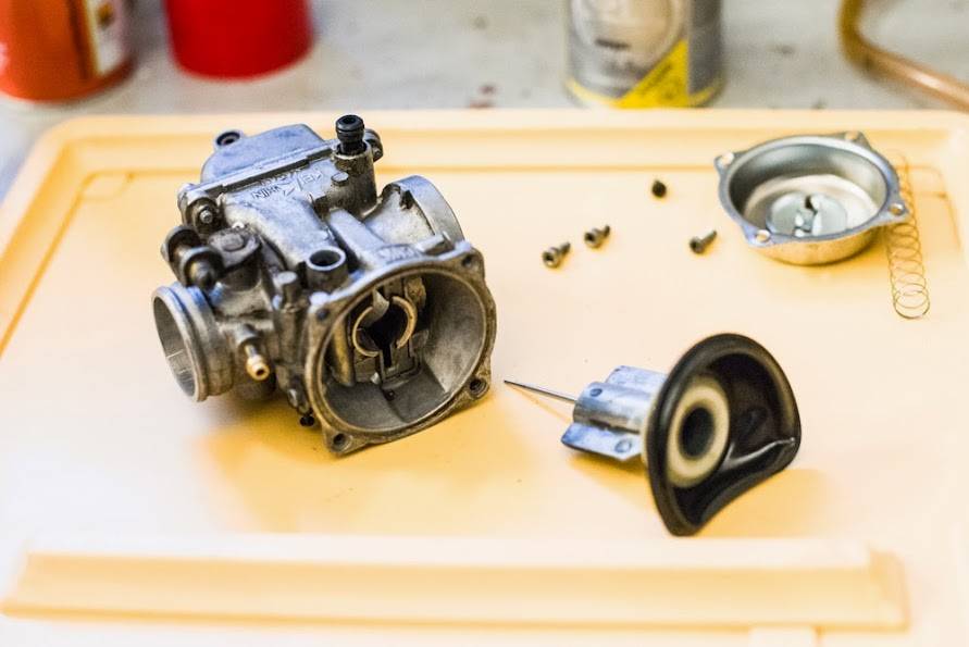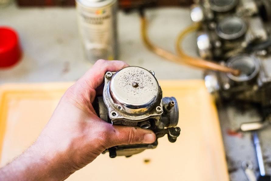 Ну вот четыре грязнули у нас в руках… и с какой стороны к ним подойти в первую очередь? правильно — отмыть =) чем и как? я для этих нужд использовал омыватель цепи для сложных мест, и очиститель тормозных дисков для всего остального, им же я и карбы продувал по началу, окончательно продувал спец средством для карбов. Взял я этот сложный механизм домой, думал сейчас с пивком быстренько их переберу… дома быстренько чухнул — бензом то воняет, дети спят в соседних комнатх… а главной причиной отложить работу в сторону стал тот факт, что рукожоп из германии, который их трогал последним, по слизывал нах половину шляпок винтиков шурупчиков… Таки пришлось тащить карбы на службу и там уже аккуратно флексом делать прорези под простую минусовую отвёртку. открутил. потом за купился болтиками под шестигранник и поменял все, даже живые.