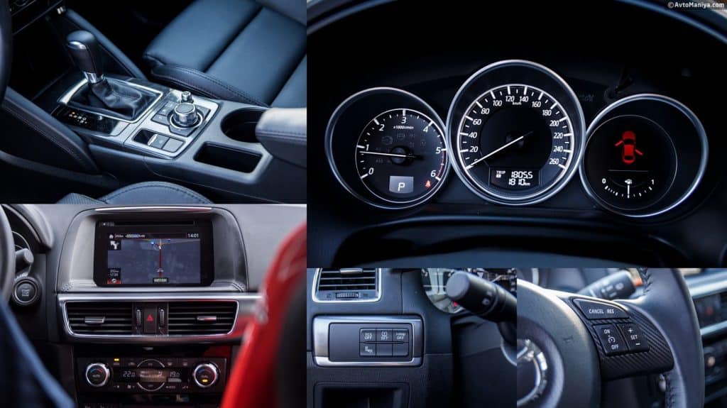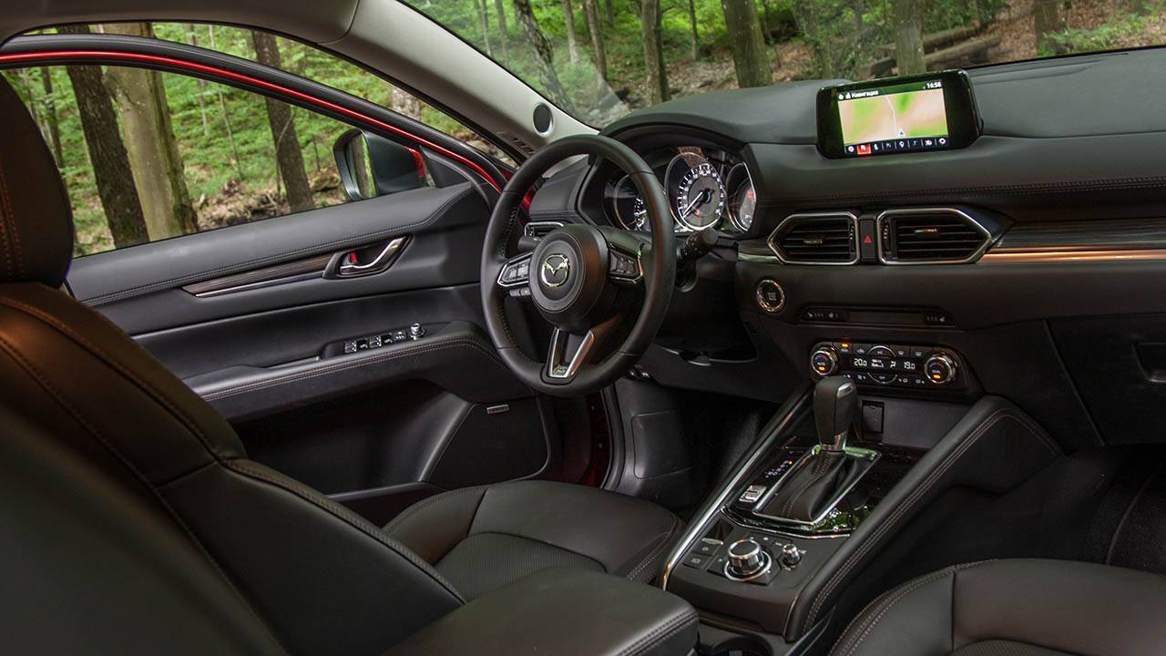 Интерьер отличается хорошей эргономикой и качественными материалами отделки. Сиденья могут быть обшиты тканью или кожей, причем на выбор предлагаются два цвета — черный или песочный. Управление различными системами осуществляется как с помощью шайбы на центральной консоли, так и посредством сенсорного дисплея. Как и положено современному автомобилю, Mazda CX-5 оснащен USB-разъемами и портами для плееров, системой беспроводной связи Bluetooth, и даже имеется навигация на русском языке.