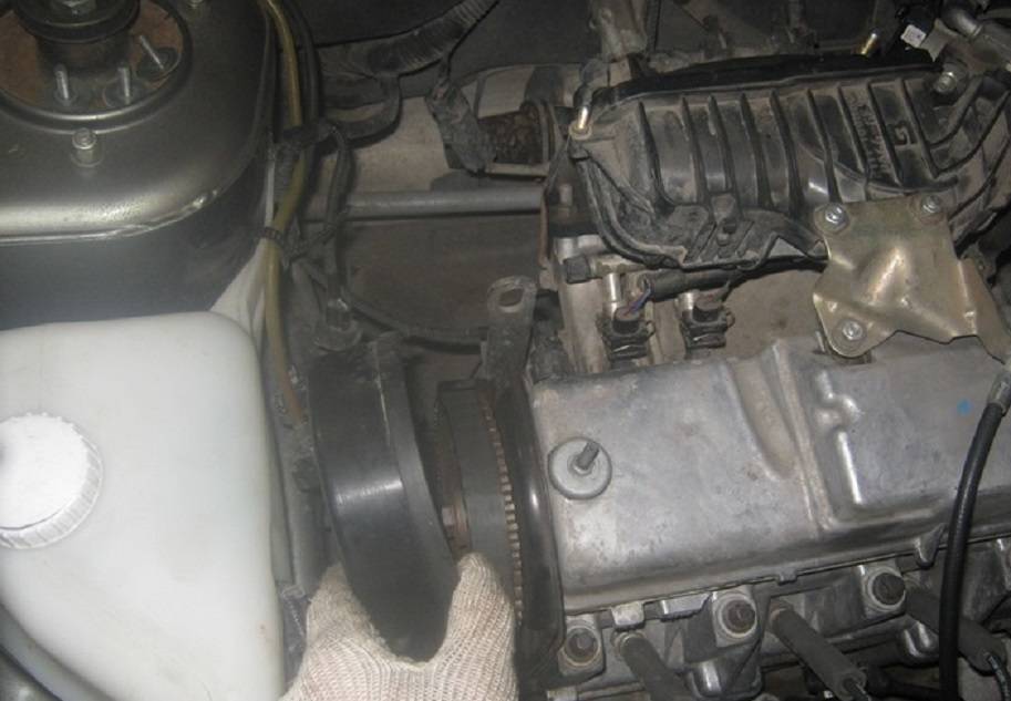 На инжекторных версиях потребуется удерживать отверткой маховик, чтобы он не проворачивался, параллельно откручивая болт шкива. Также есть решение пригласить напарника, включить пятую передачу в салоне и нажать на педаль тормоза.