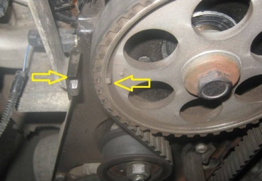 На следующем этапе необходимо выставить метки. Для этого нужно провернуть коленчатый вал за болт крепления шкива, пока метка распредвала не совпадет с меткой на крышке.